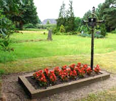 Auf dem Friedhof eine sehr gut gepflegte Grabstelle für vier Kriegstote mit Kreuz und schwarzer Namenstafel mit Eisernem Kreuz.