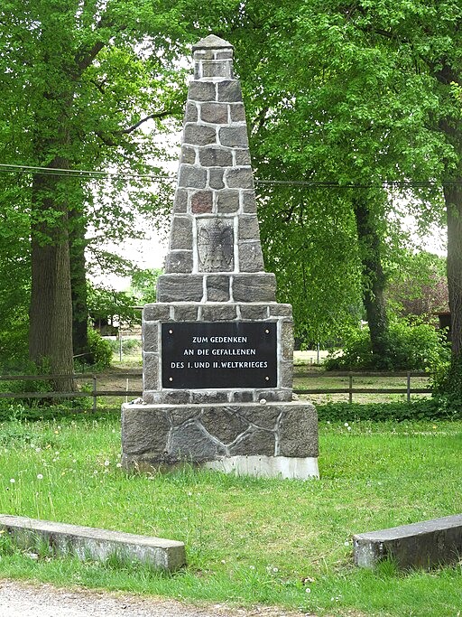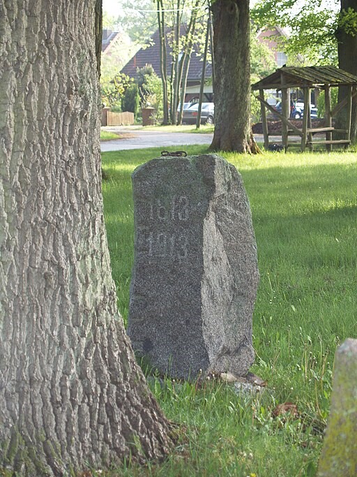 Auf dem Dorfplatz ein Gedenkstein (Findling) 1813/1913 unter Eichen, ursprünglich einmal von einer Kette umgeben.