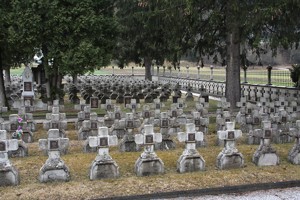Italienischer Teil des Soldatenfriedhofes (Grabfeld H), auf einem 2-stufigem Podest stehendes Denkmal, Inschriften an allen Seiten, Grabkreuze aus Beton.