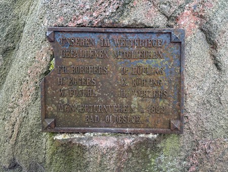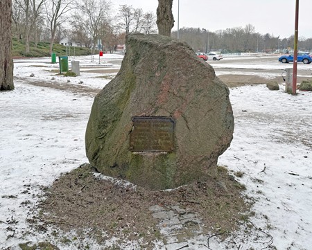 Ein etwa mannshoher Findling mit einer eisernen Gedenkplakette.
