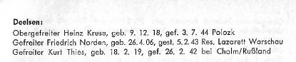 | Gefreiter | THIES | Kurt | 18.02.1919 | 26.02.1942 Cholm, Rußland |