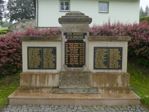 Säule mit zwei Seitenwänden auf einem Steinsockel. Es sind drei Gedenktafeln angebracht.