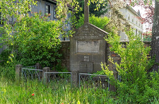Im oberen Bereich stehen die Namen der Gefallenen des Ersten Weltkrieges, am Fuß ist eine kleine Tafel für die Opfer des Zweiten Weltkrieg angebracht