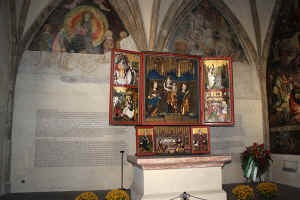 Kriegergedächtnisstätte in der Magdalenenkapelle, außen drei Tafeln, innen Flügelaltar, an der Wand oben Fresken, darunter Namenslisten.