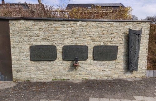 Gemauerte Wand auf dem Friedhof, darauf angebracht drei Bronzeplatten mit Eisernem Kreuz,