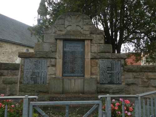 Kriegerdenkmal an der Außenseite der Friedhofsmauer mit drei Gedenkplatten.