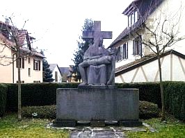 Bei der Kirche befindet sich das Kriegerdenkmal. Ein Steinsarkophag, darauf eine Sterbeszene mit Kreuz im Hintergrund.