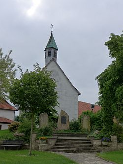 Drei Steinfindlinge mit Gedenkplatten vor der Kirche.