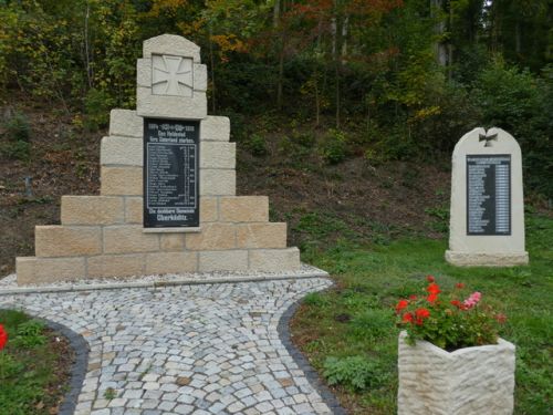 Pyramidenförmiges Kriegerdenkmal aus bearbeiteten Natursteinen, oben ein Deutsches Kreuz.