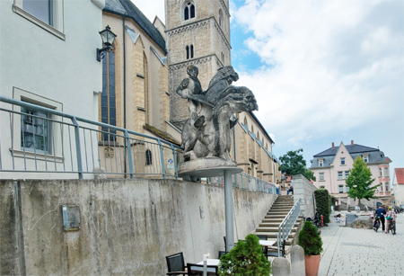 Das Reiterstandbild steht vor der Mauer an der Hauptstraße unterhalb der Stadtpfarrkirche St. Andreas.