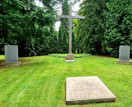 Davor ist ein symbolisches Grab angelegt, mit Inschrift für die in der Fremde Bestatteten.