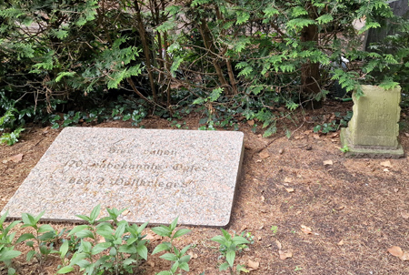 Sammelgrab für 120 unbekannte Kriegsopfer. Neben dem hellen Gedenkstein steht ein einzelner Grabstein mit Name.