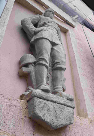 Die Gedenk-Skulptur für die gefallenen Feuerwehrleute befindet sich am Wallgebäude und wurde erst