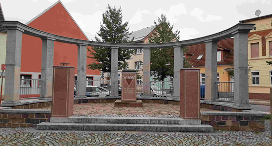 Halbrunde Säulen-Arkade, davor drei Stelen, die mittlere mit Widmung und oben liegendem Ehrenkranz.