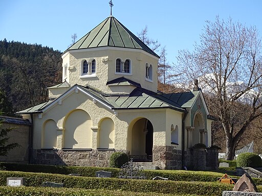 Im Stadtteil Pradl, im Ostfriedhof, im Mausoleum, in einer Nische eine Kupfertafel auf schmiedeeisernem Kreuz und Heiligenbild,