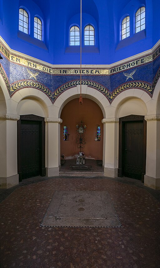 in den anderen Nischen Gedenktafeln, oben Rundumschrift in Mosaikform.