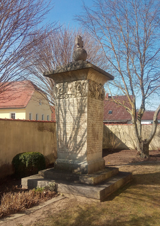 Quadratische Säule mit den eingeschlagenen Namen und Sterbedaten der Gefallenen und Vermissten des