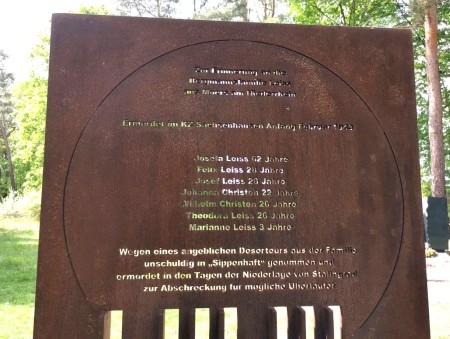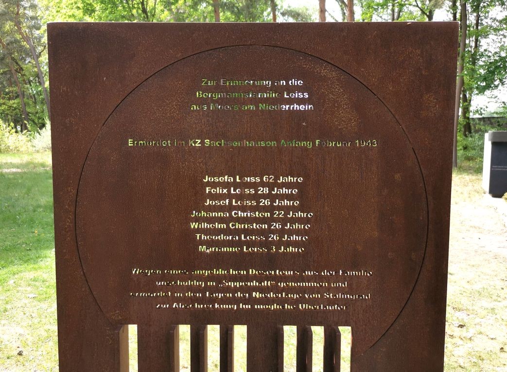 „Zur Erinnerung an die Bergmannsfamilie Leiss aus Moers am Niederrhein (Namen). Wegen eines angeblichen Deserteurs aus der Familie unschuldig in „Sippenhaft“ genommen und ermordet in den Tagen der Niederlage von Stalingrad zur Abschreckung für mögliche Überläufer“ www.sachsenhausen-sbg.de/veranstaltungen/2023-02-04t000000z-einweihung-des-denkmals-fuer-die-familie-leiss/ |