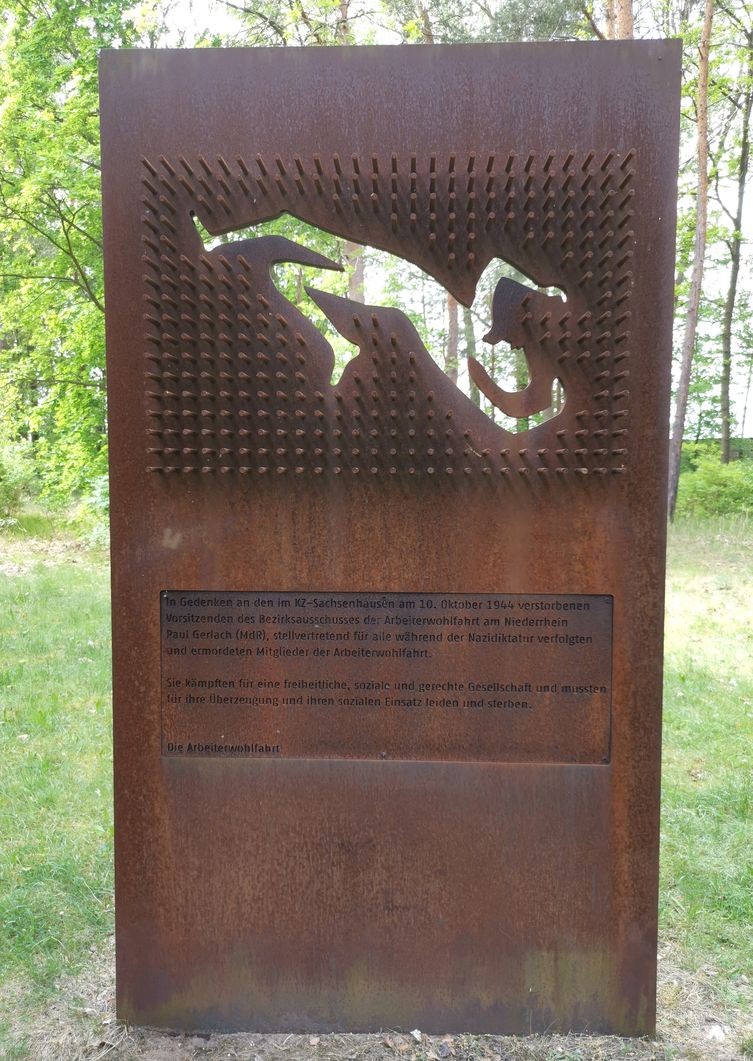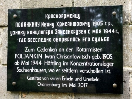 „Zum Gedenken an den Rotarmisten (Name) ab Mai 1944 Häftling im Konzentrationslager Sachsenhausen, wo er seitdem verschollen ist.“ |