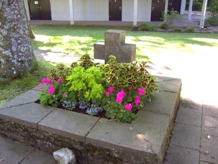 Drei Quadratische Felder auf dem Friedhof. Eines davon mit Steinkreuz und einer Inschrift,
