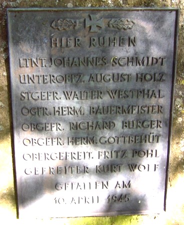 Ein Steinfels mit einer Platte kennzeichnet die Gräber der Gefallen vom 10. April 1945.
