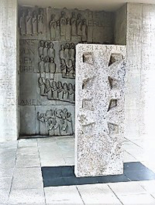 Freistehende Stele mit zwei übereinander liegenden Tatzenkreuzen. An der Wand dahinter ein Relief betender Menschen.