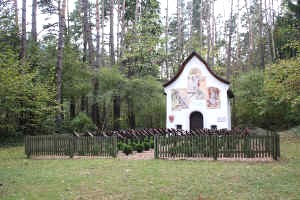 In einem Wald ca. 1 km außerhalb vom Ort Kriegerdenkmal in Form eines Soldatenfriedhofs, überdachte Holzkreuze,