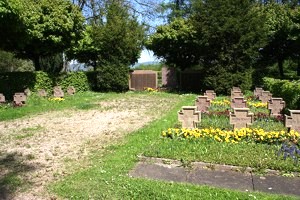 Soldatengräber: Steinkreuz in „EK“-Form; auf der Fläche nebenan Kriegsgräber, eine Reihe von Steinquadern (Zweiter Weltkrieg).