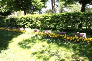 innen rund um die Fläche kleine Pyramiden aus rotem Sandstein mit jeweils einem Namen (Erster Weltkrieg).