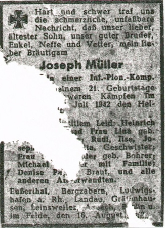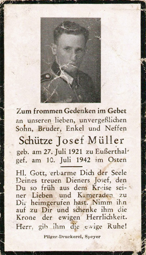 | Schütze | MÜLLER | Josef | 27.07.1920 Eußerthal | 10.07.1942 im Osten, Russland |