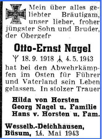 | Obergefreiter | NAGEL | Otto-Ernst | 18.09.1918 Wesselburen | 04.05.1943 im Osten; Nowo Sowinuchowo |