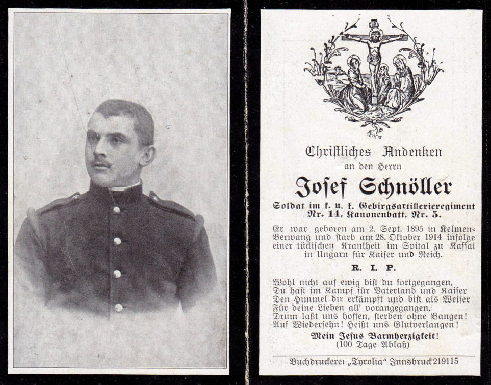 | Soldat | SCHNÖLLER | Josef | 02.09.1885 Kelmen Nr. 8 |