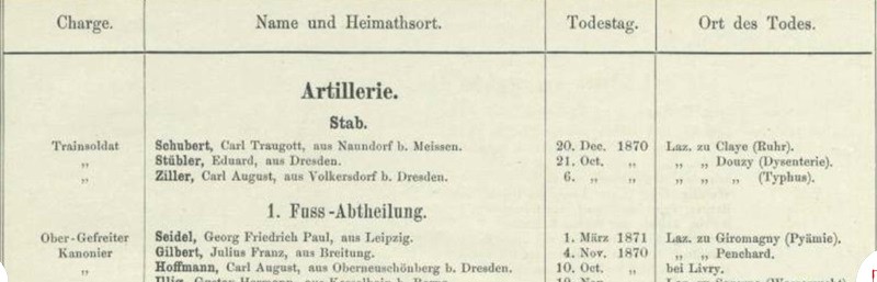 | Kanonier | KÖHLER | Ernst Ludwig | Großhartmannsdorf | 08.12.1870 Laz Douzy |