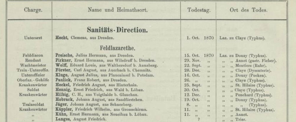 | Felddiacon | PREISCHE | Julius Hermann | Dresden | 15.10.1870 Laz Douzy |