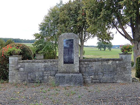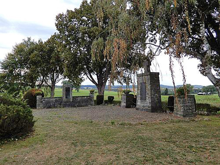 Steinsäule aus bearbeiteten Natursteinen mit einem Kreuz,darin eine Gedenkplatte.