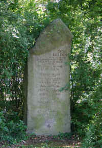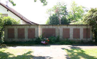 Gedenktafeln aus rotem Sandstein (WK2), links davon, zwischen Bäumen,