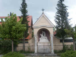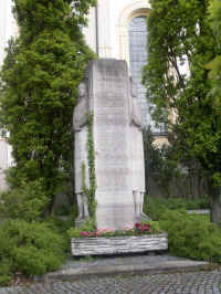 Pfaffenhausen (Ortsfriedhof), Landkreis Unterallgäu, Schwaben, BayernKapelle auf dem Ortsfriedhof. Denkmal vor der Kirche