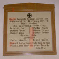 Holztafel mit einer Namenslist unter einem Eisernen Kreuz
