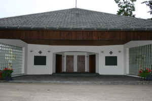 der Abdankungshalle, zwei Gedenktafeln und oberhalb ein Deutsches Kreuz.