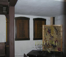 Holztafeln mit schwarzer Schrift in der Klosterkirche in Thal