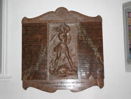 der Kirche: eine braune Marmortafel an der Seitenwand rechts,