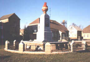 Mitte des Dorfes ein eingezäunter Obelisk, der oben eine bunt