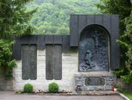 Denkmal an der Friedhofsmauer: rechts Metallplastik, Soldat