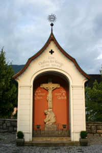 Kapelle gestaltet, mit Kruzifix und knieendem Soldaten, Gedenktafeln innen.