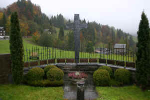 Friedhof: auf der Friedhofsmauer grosses Metallkreuz, daneben