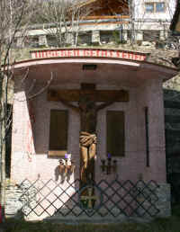 Bei der Kirche; vorne offenes Gedenkhäuschen, grosses Holzkreuz