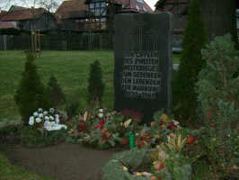 Das Denkmal in Form eines banalen Grabsteins steht hinter der