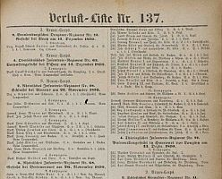Quelle: Deutsch-französischer Krieg, 1870-71, Verlust-Liste. Hrsg.: Königliche Geheime Oberhofbuchdruckerei, Berlin. Gebundene Zusammenfassung der fast täglich während des Krieges herausgegebenen Verlustlisten.